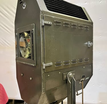 This was followed by the Patt. 52, introduced in the late 1940s. The Patt. 52 used a 1 kW non‑halogen tungsten incandescent lamp with a condenser‑based optical system, offering improved practicality and reliability. It became a familiar sight in repertory theatres and early television studios, typically operated by technicians who understood its behaviour intimately — adjusting disc speed, focus, and shuttering to create subtle atmospheric movement rather than overt spectacle.